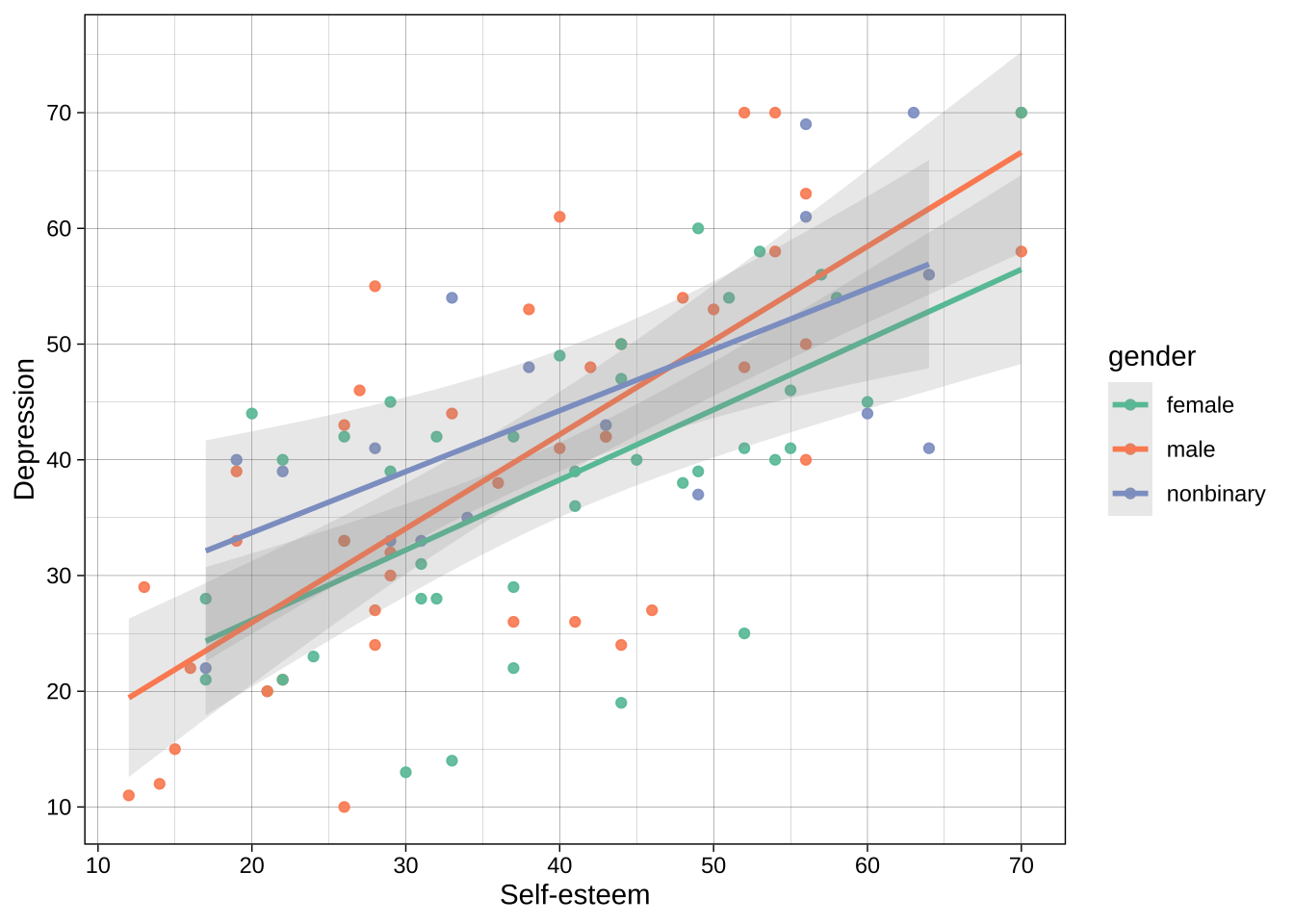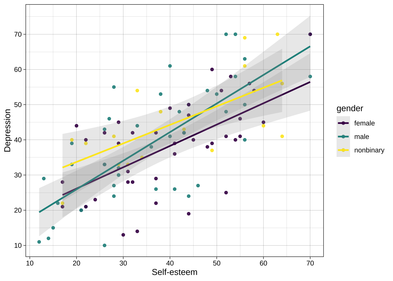 p <- p + geom_smooth(method = "lm") # linear regression line using lm()