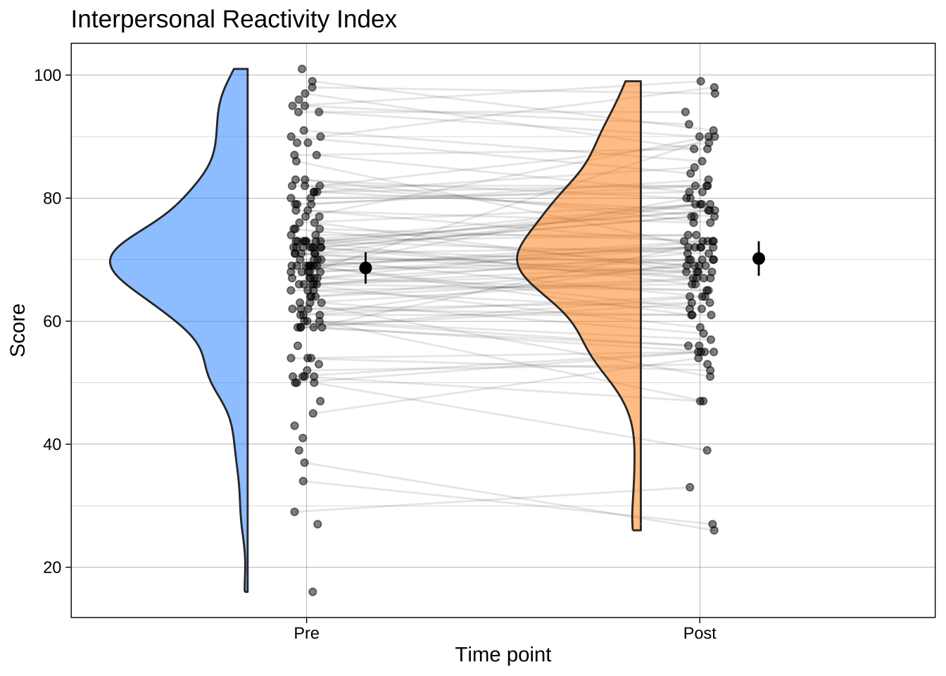 - Plot 1: Create a density plot of the IRI scores, using different colors for the two timepoints. Clean up the axes, theme, colors, etc.