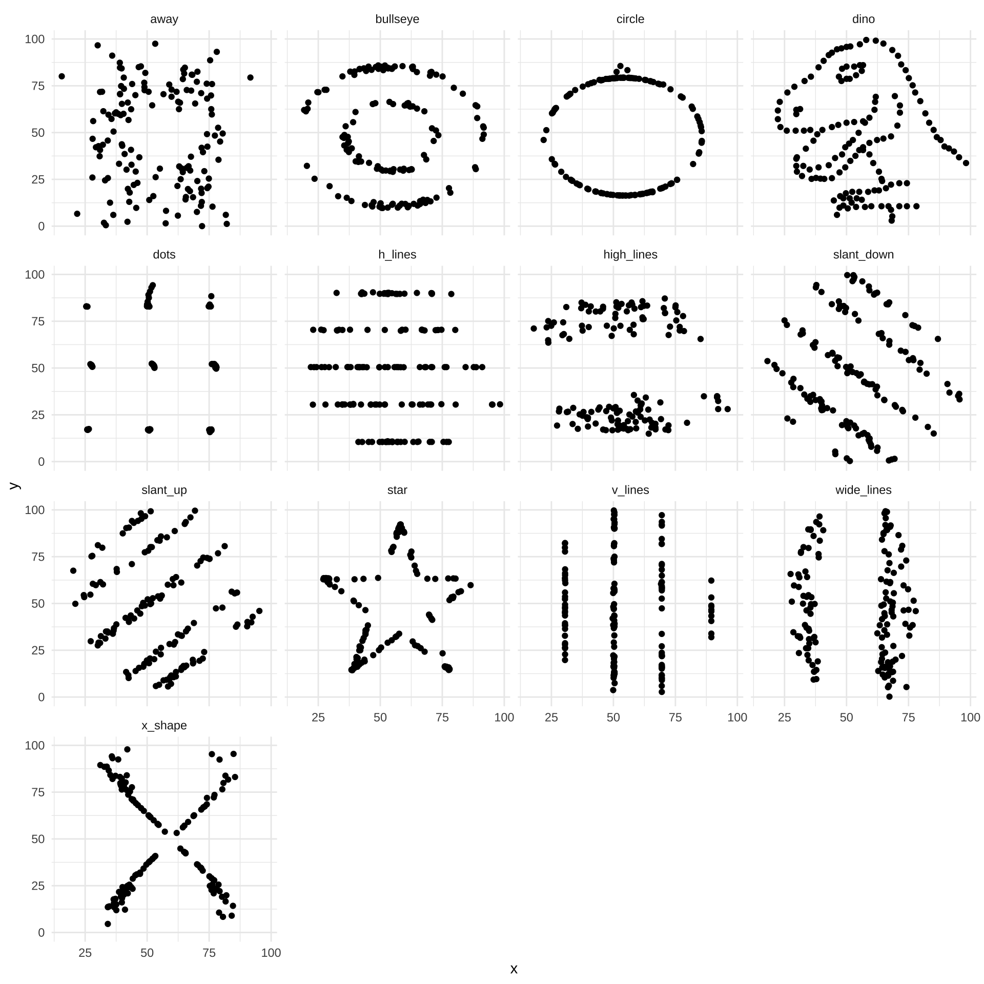 ggplot(datasaurus_dozen, aes(x = x, y = y)) +