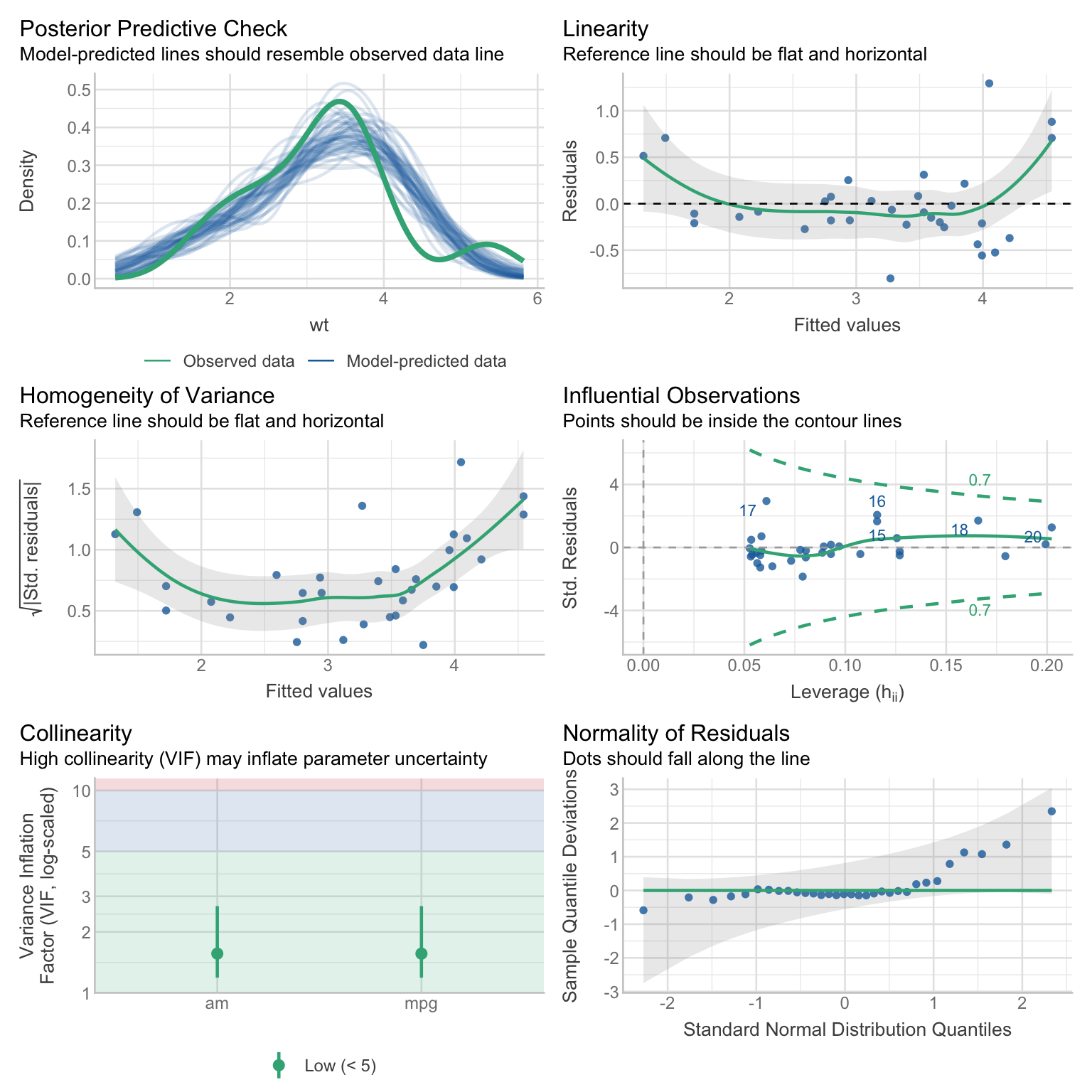 report(model)We fitted a linear model (estimated using OLS) to predict wt with am and mpg