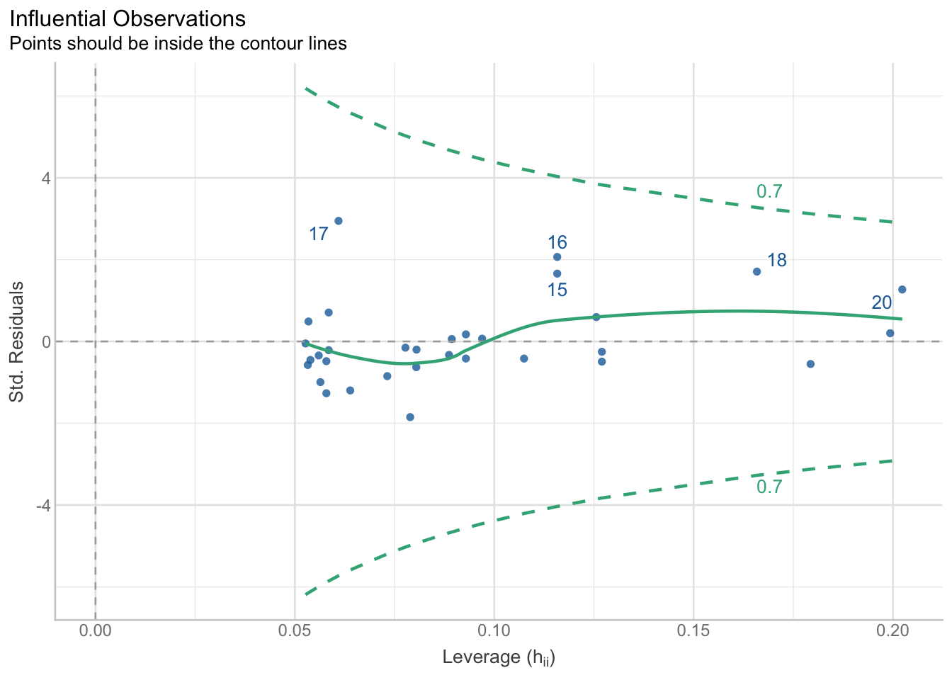 res_outliers <- check_outliers(model, method = "cook") # "all" requires other dependencies and can take some time to run