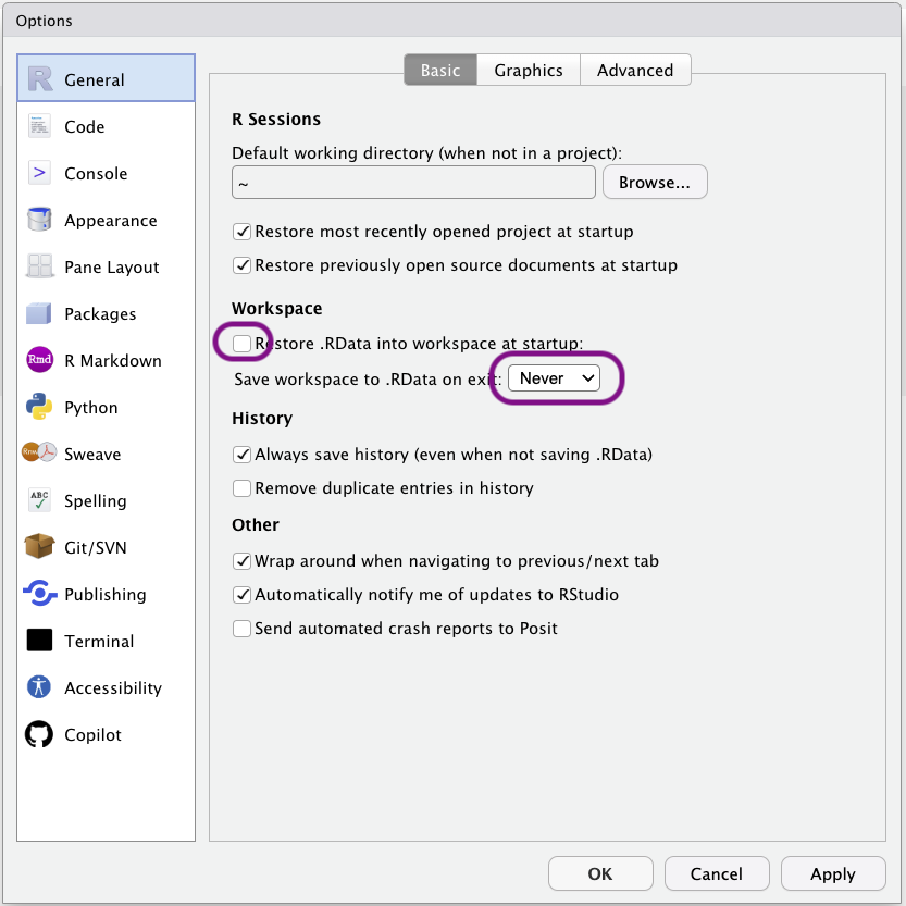 For reproducibility, please ensure RStudio’s settings never save the objects in your environment to disk on exist or load them again when opening RStudio. Open the Tools>Global Options menu, go to General, and untick the following box and set save to ‘Never’.