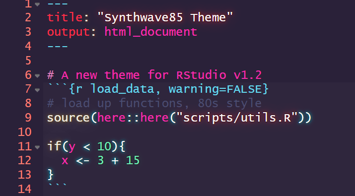 The objectively coolest theme of them all is Synthwave85, which can be installed by running the following line of code in RStudio’s console: rstudioapi::addTheme("https://raw.githubusercontent.com/jnolis/synthwave85/master/Synthwave85.rstheme", TRUE, TRUE, FALSE)